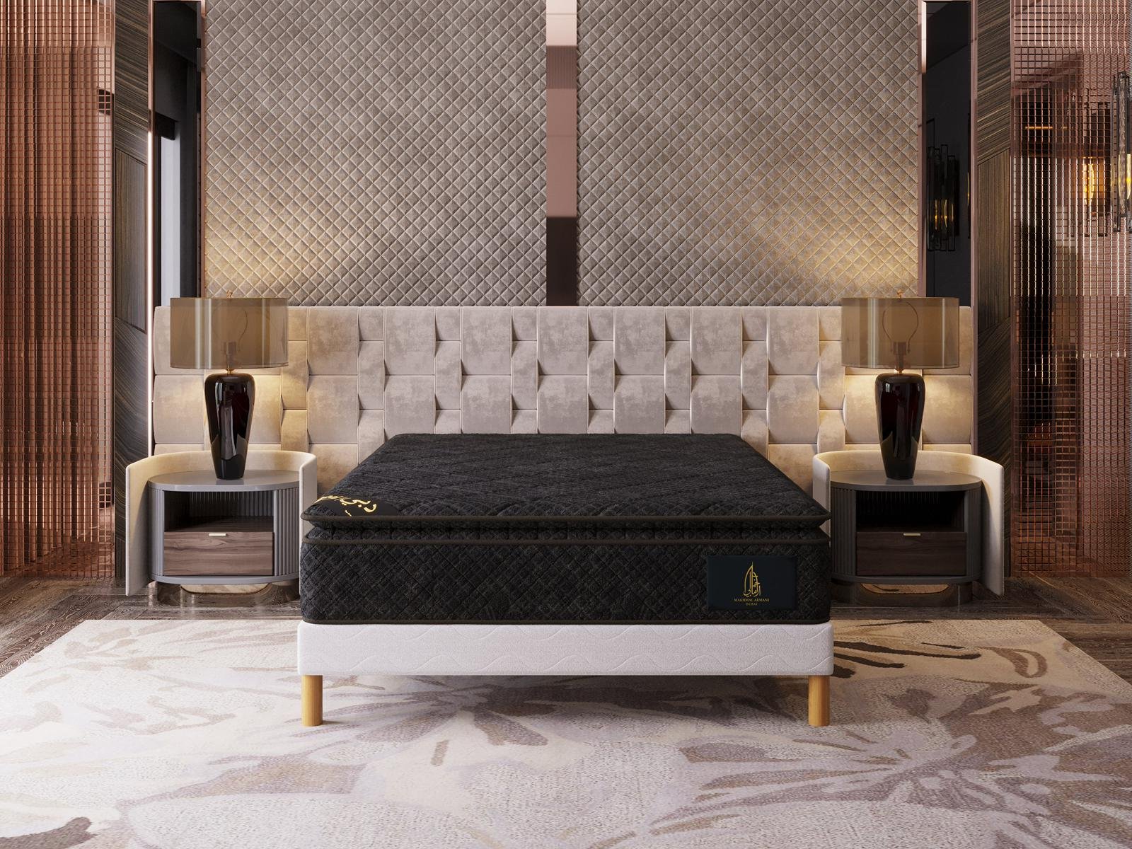 Offrez-vous des nuits d’exception avec le matelas MAKHMAL ARMANI DUBAI, une création exclusive mêlant luxe, confort et soutien de qualité hôtelière. Avec ses 33 cm d’épaisseur, son revêtement en velours somptueux noir ou crème, et son surmatelas intégré, ce modèle haut de gamme transforme votre lit en véritable cocon.