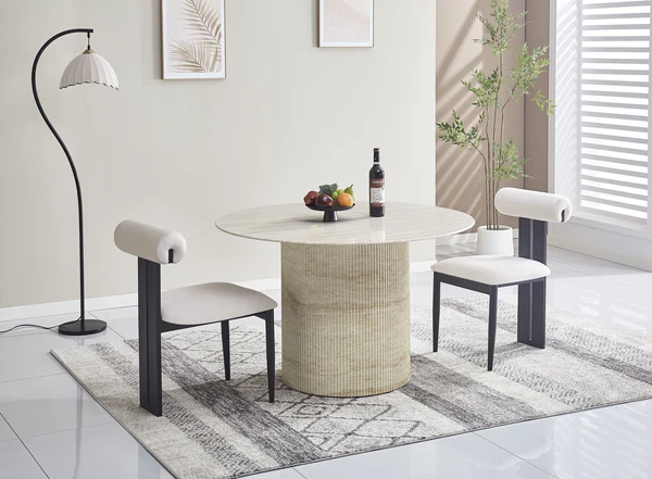 Son plateau rond en céramique effet travertin capte la lumière avec élégance, tandis que son pied central assorti offre un rendu à la fois moderne et luxueux ✨