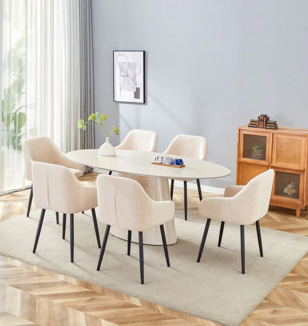 La table à manger Ova séduit par sa forme ovale douce et son plateau en céramique effet travertin, qui évoque la beauté des pierres naturelles tout en offrant robustesse et facilité d’entretien✨