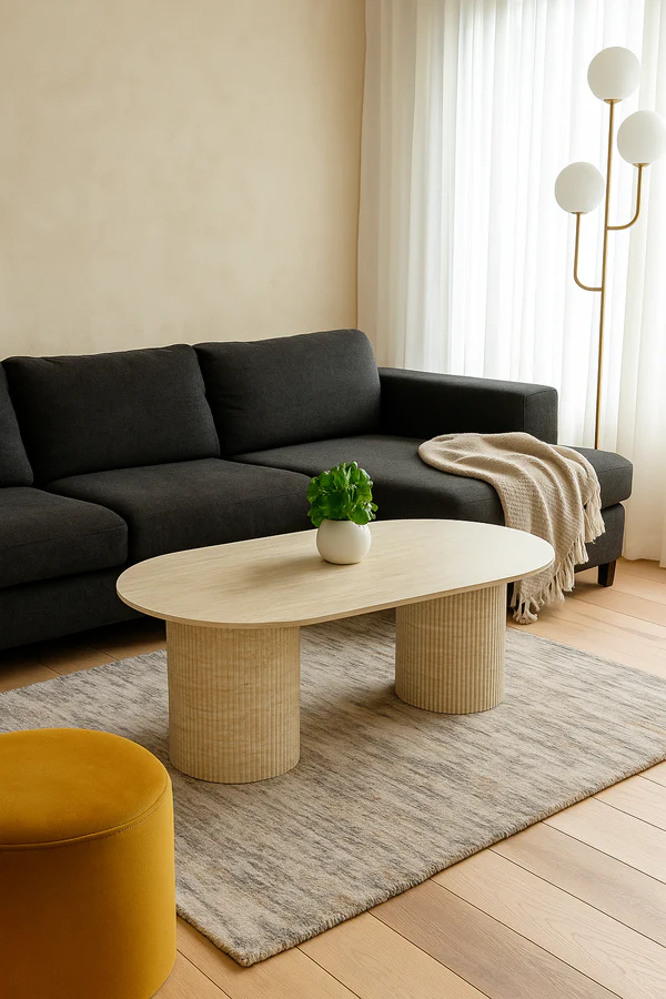 La table basse ronde Calypso, avec son plateau en céramique et son pied en effet travertin, allie design moderne et praticité✨